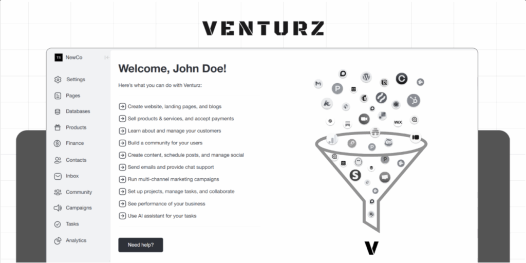 Venturz also supports social media integrations and project management features, allowing users to manage conversations, campaigns, and tasks from a single dashboard. With an easy interface and scalable features, it suits solopreneurs who want structure without complexity.